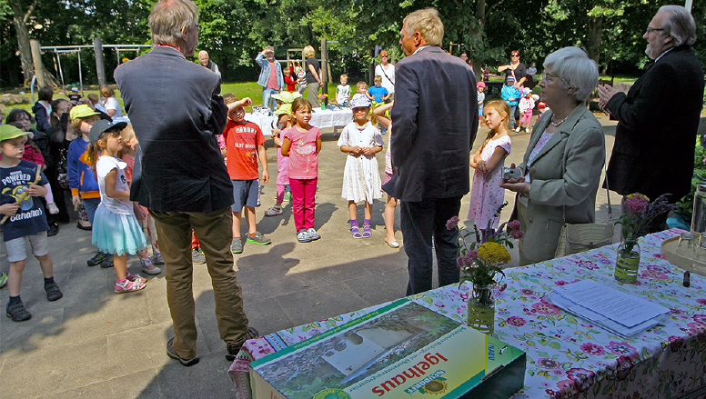 Christian Bruns (Vorstandsmitglied der Bremerhavener Bürgerstiftung), Wilfried Töpfer (1. Vorsitzender des Grünen Kreises Bremerhaven), Barbara Sandmann (2. Vorsitzende des Grünen Kreises Bremerhaven) und Stadtrat Klaus Rosche (von links) bei der Begrüßung der Kinder. (9/29) |