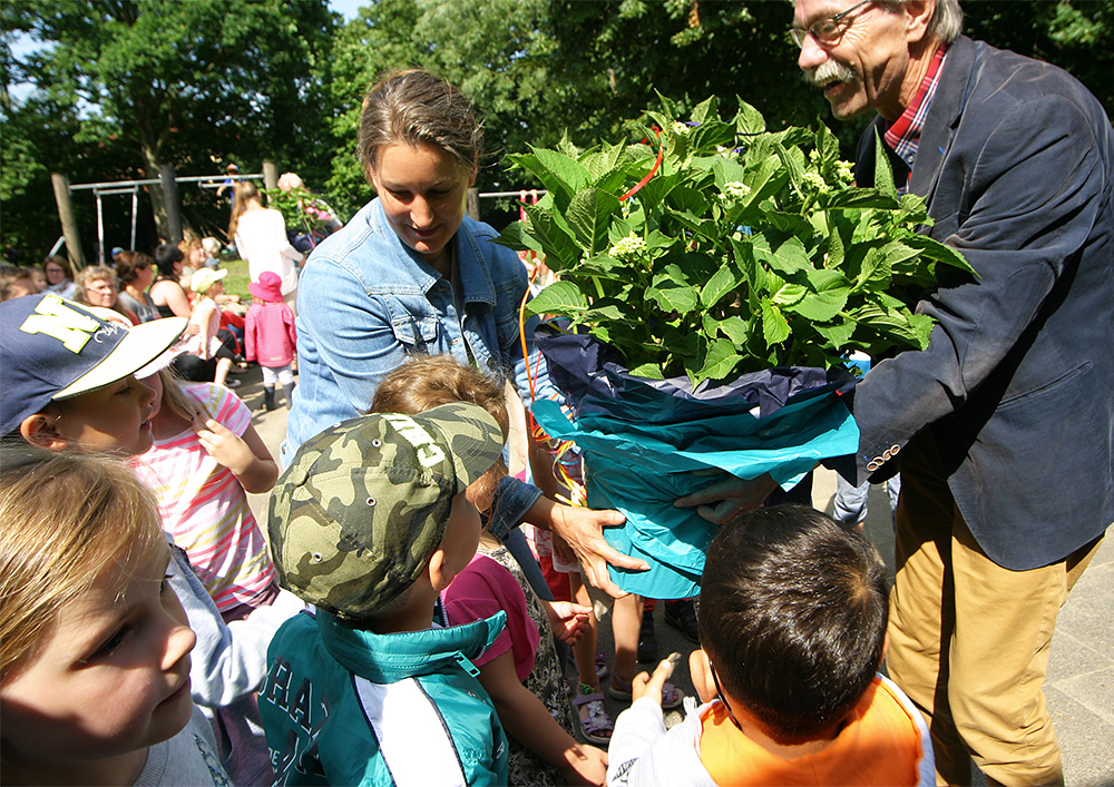 Christian Bruns (Vorstandsmitglied der Bremerhavener Bürgerstiftung) überreicht einem der Kindergärten eine Hortensie. (15/29)