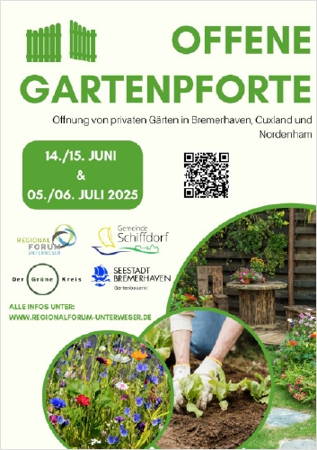 Im Rahmen der Aktion „Offene Gartenpforte“ haben Hobbygärtnerinnen und -gärtner, Naturliebhaber und Gartenfreunde auch 2025 wieder die Gelegenheit, ihr persönliches Paradies für interessierte Besucher zu öffnen. An den Wochenenden 14. und 15. Juni sowie 5. und 6. Juli findet die beliebte Aktion in diesem Jahr statt. Das Gemeinschaftsprojekt wird vom Regionalforum Unterweser, dem Gartenbauamt Bremerhaven und dem Grünen Kreis Bremerhaven realisiert und in diesem Jahr federführend von der Gemeinde Schiffdorf begleitet.