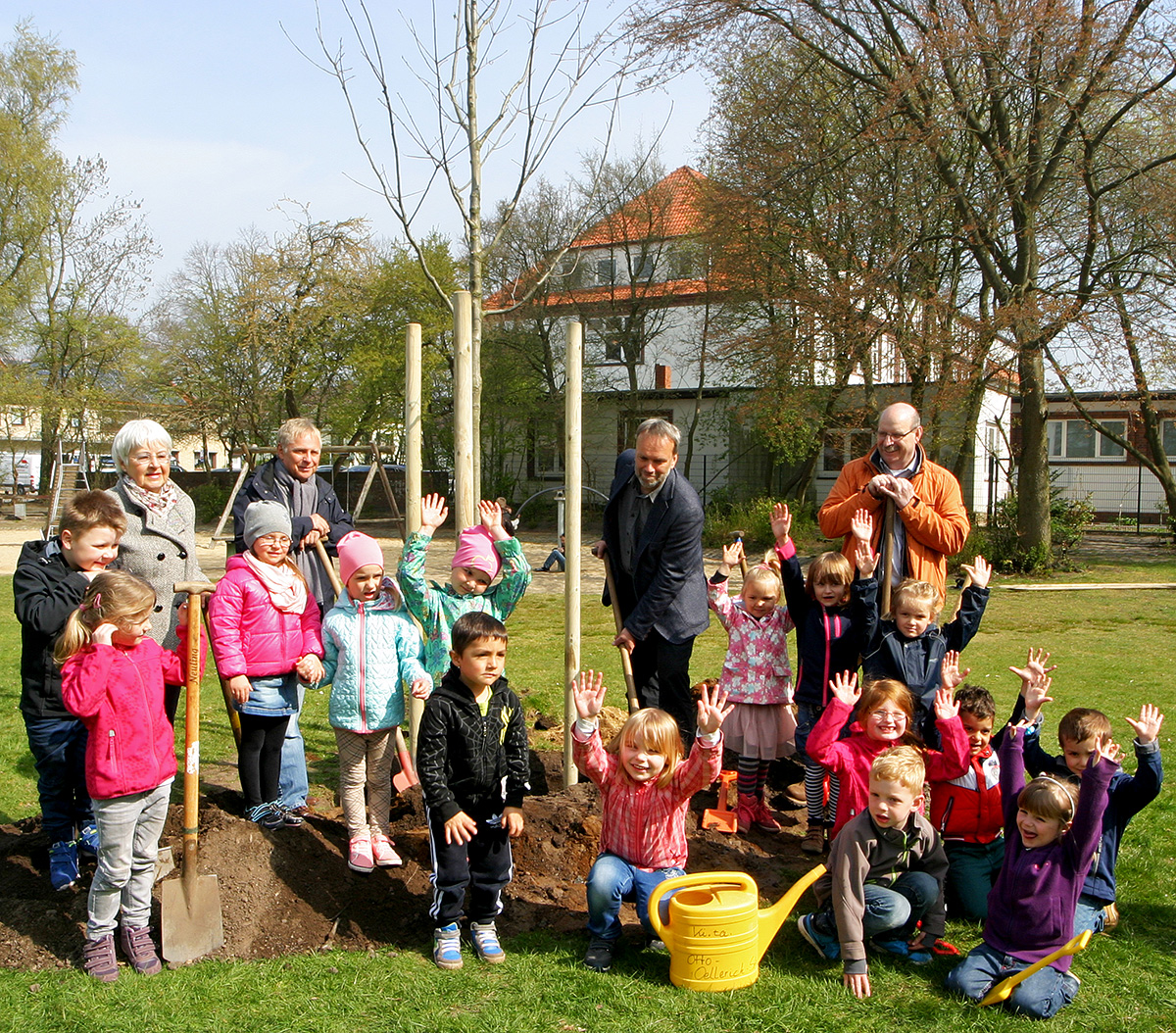 Die Pflanzstelle war durch die Mitarbeiter des Gartenbauamtes Bremerhaven vorbereitet worden und pünktlich trafen die Kinder der Kindertagesstätte ein. Mit einem Lied stimmten die Kinder sich und die anwesenden Erwachsenen auf die bevorstehende Pflanzaktion ein. Dann griffen sie zu den Spaten und den Schaufeln und schaufelten die ausgehobene Erde rund um den Wurzelballen. Wasser aus der Gießkanne erleichterte dem Baum den Start am neuen Standort.