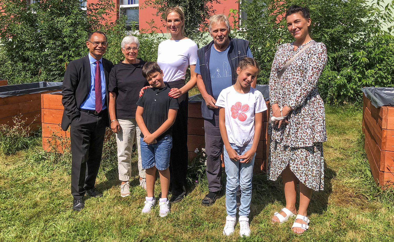 Vor den Hochbeeten und hinter zwei Schulkindern (hinten von links) Dr. Addissou Makonnen, Sybille Böschen, Nadine Porwoll, Wilfried Töpfer und Nastasia Kordyla-Balke.