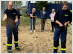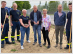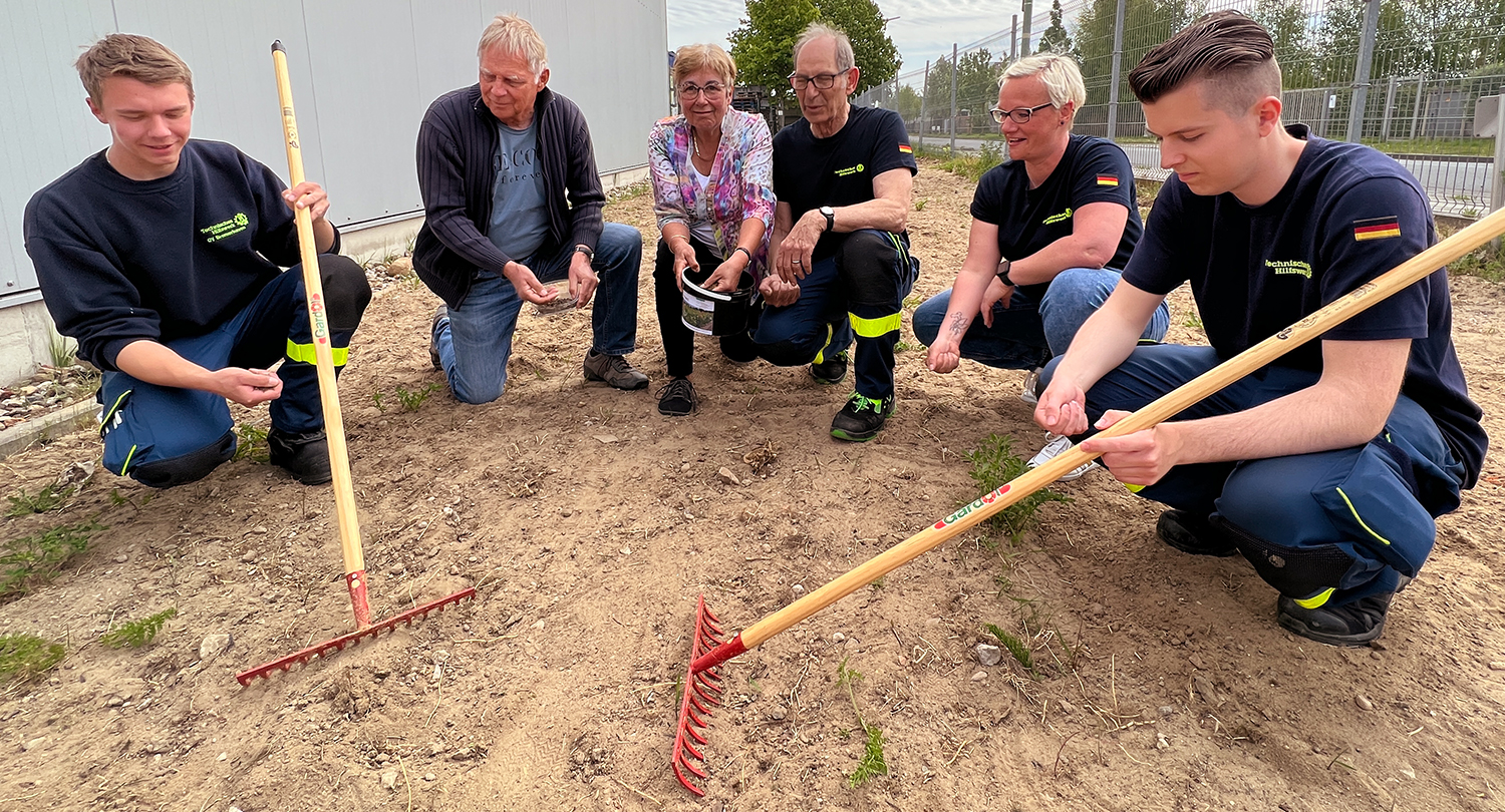 Führungskräfte des THW Bremerhaven und Mitglieder des Vorstandes des Grünen Kreises Bremerhaven säten am Dienstag, 10. Mai 2022, die Saat für die zukünftige Wildblumenwiese auf dem Betriebsgelände des THW Bremerhaven ein.