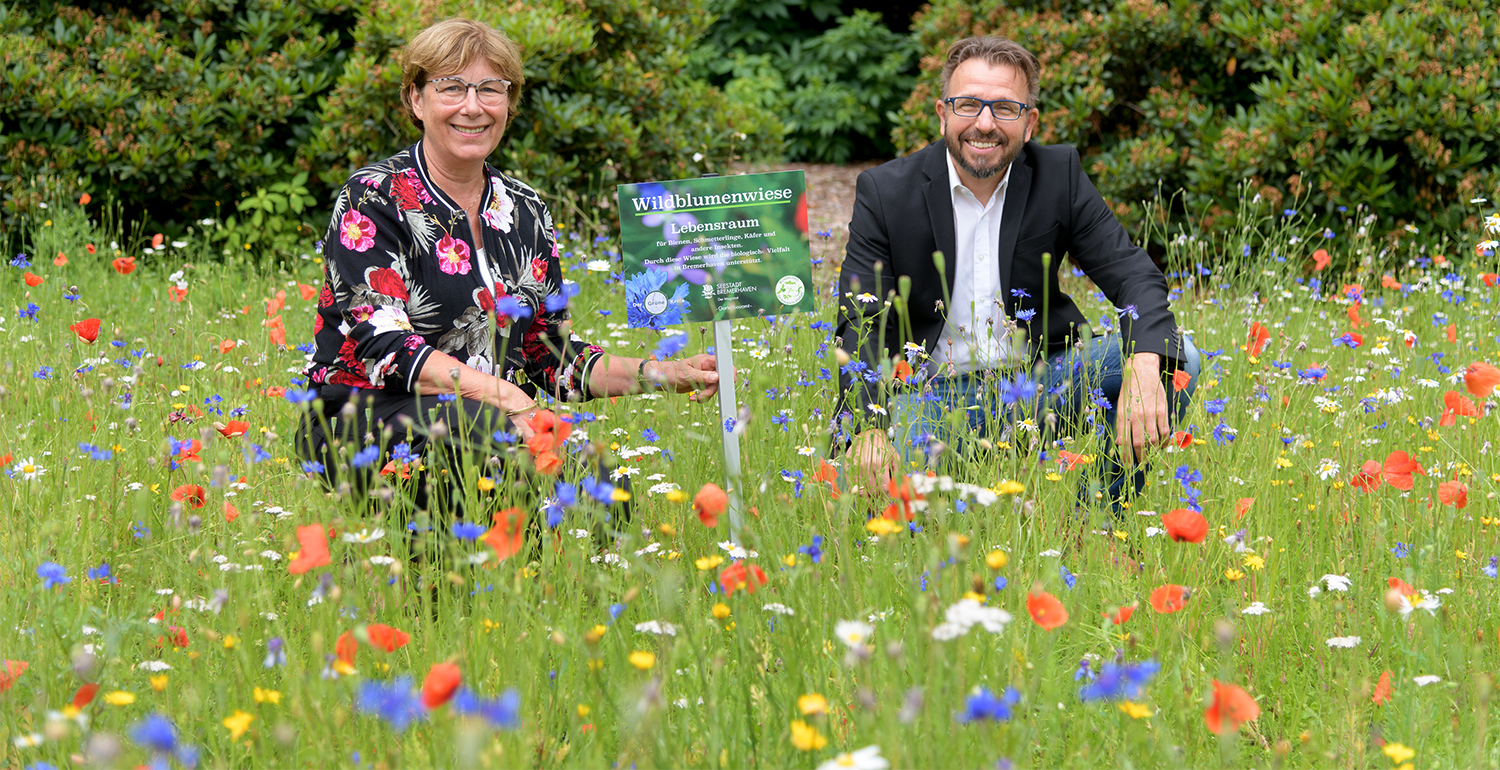 Frank Stickel und Sybille Böschen auf der Wildblumenwiese auf dem Waldemar-Becké-Platz. Foto: GEWOBA (Anklicken zum Vergrößern)